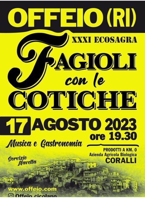 Sveliamo in anteprima, come Offeio porterà’ attraverso la moda anche un messaggio di speranza e di pace. L’estate prosegue all’insegna del buon cibo con la sagra dei “Fagioli con le cotiche”, giunta alla sua 30° edizione. Novità esclusiva sarà l’utilizzo di prodotti a km0 dell’Azienda Agricola Biologica Coralli e stand di dolci.